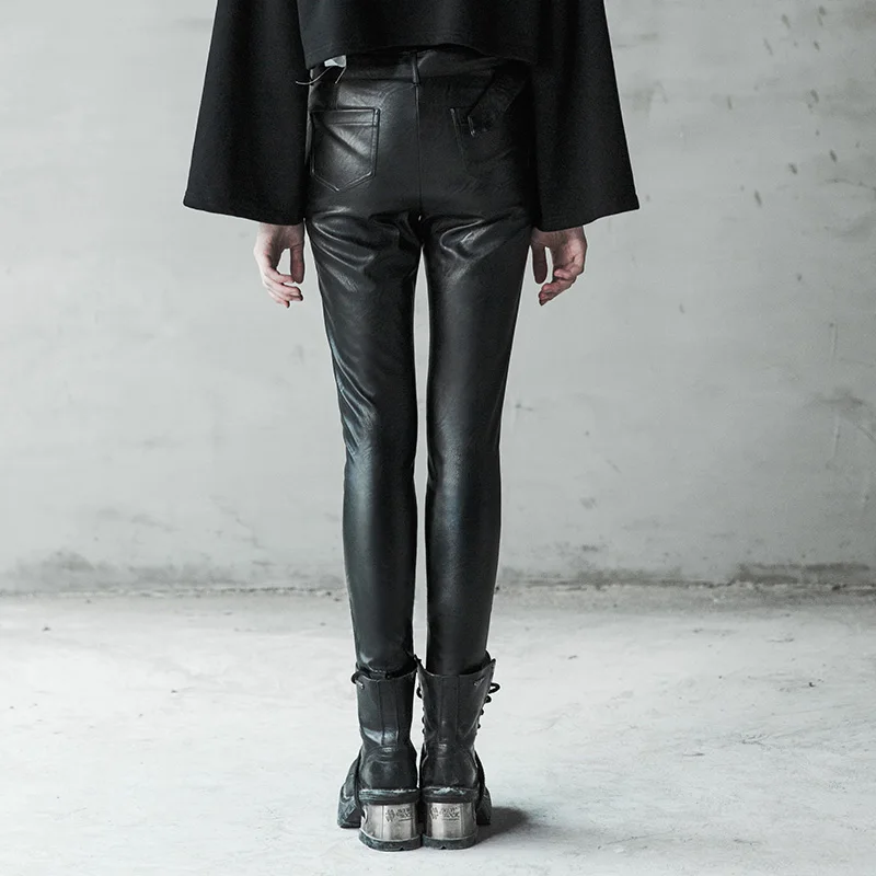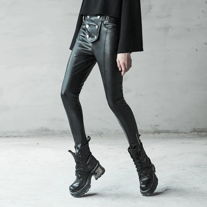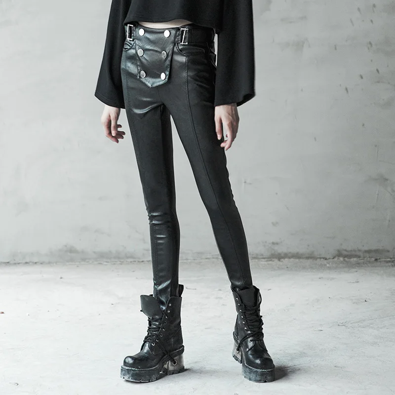 Promo PUNKRAVE Military Style Wind Double-breasted Tight-fitting Wild Leather Pants Stretch Plus Velvet Leggings Slim Trousers Female