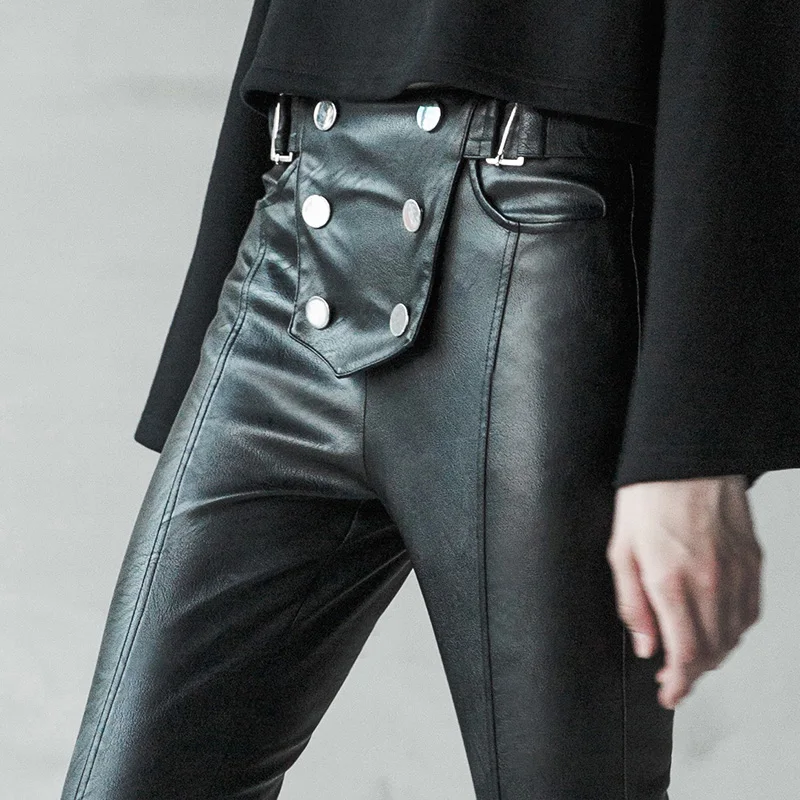 Sale PUNKRAVE Military Style Wind Double-breasted Tight-fitting Wild Leather Pants Stretch Plus Velvet Leggings Slim Trousers Female
