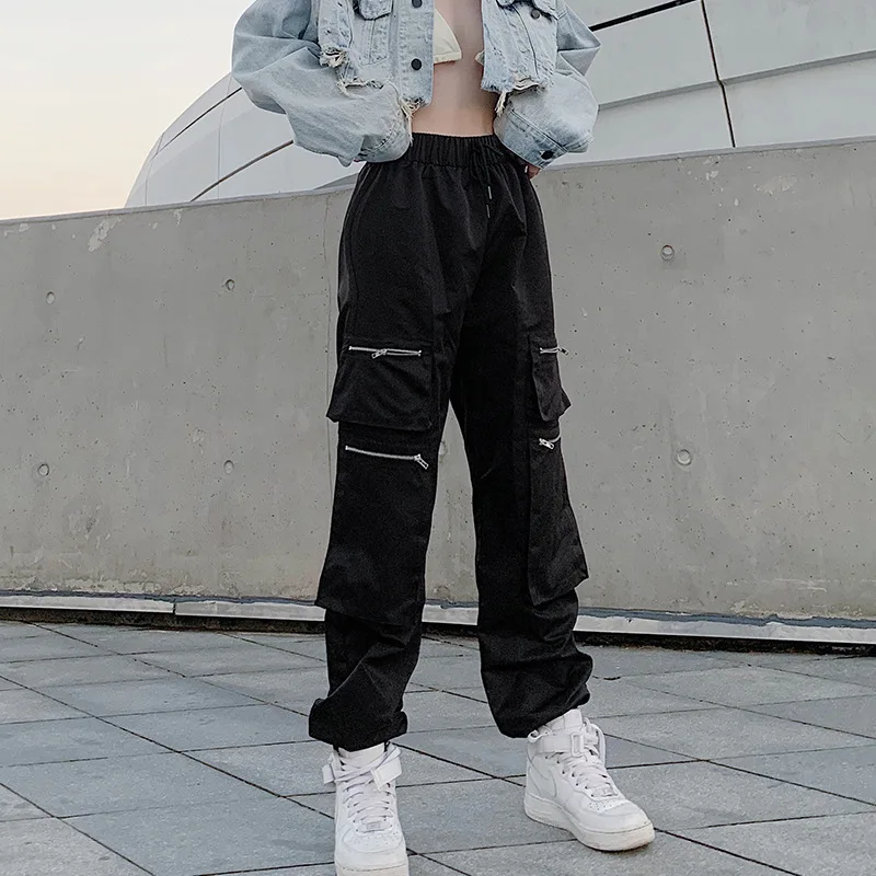 Best Offer Deeptown Cargo Pants Women Black Trousers Pockets Bunch Legs Pantalon Femme Zipper Loose Casual Work Pants Streetwear