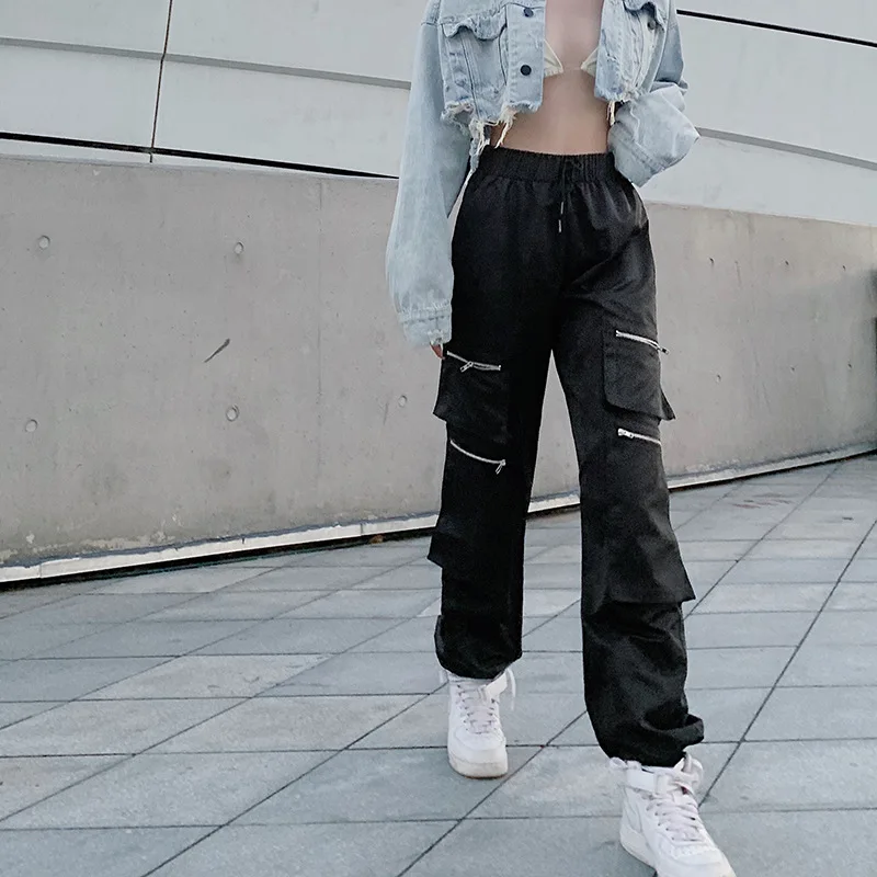 Sale Deeptown Cargo Pants Women Black Trousers Pockets Bunch Legs Pantalon Femme Zipper Loose Casual Work Pants Streetwear