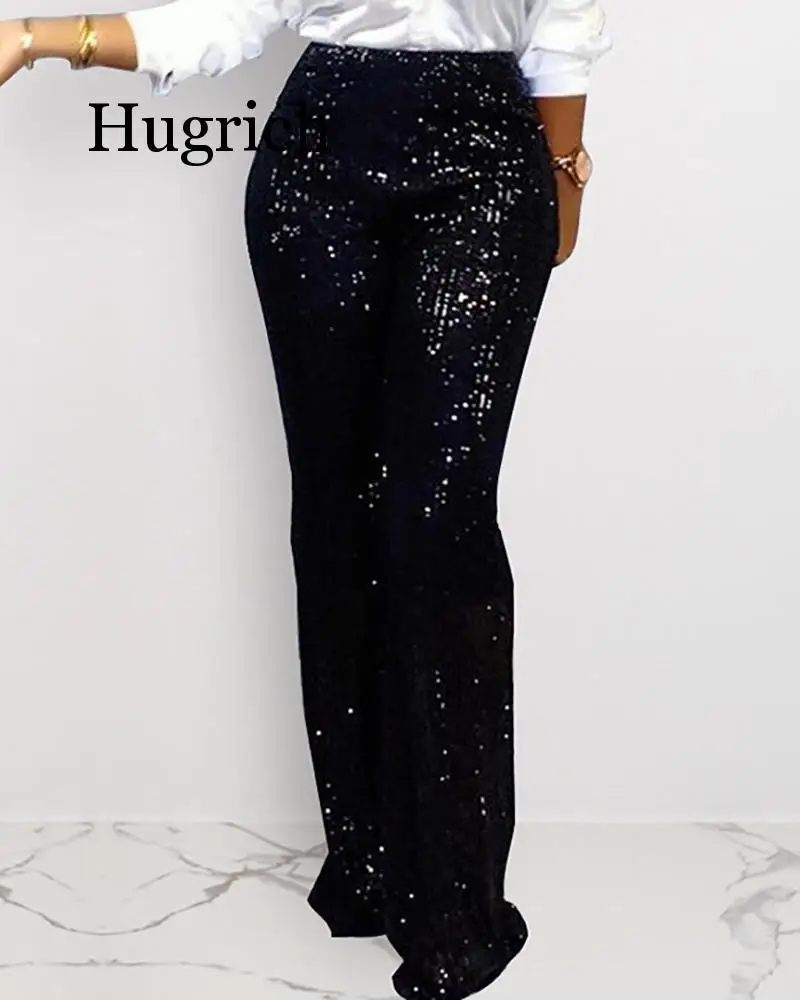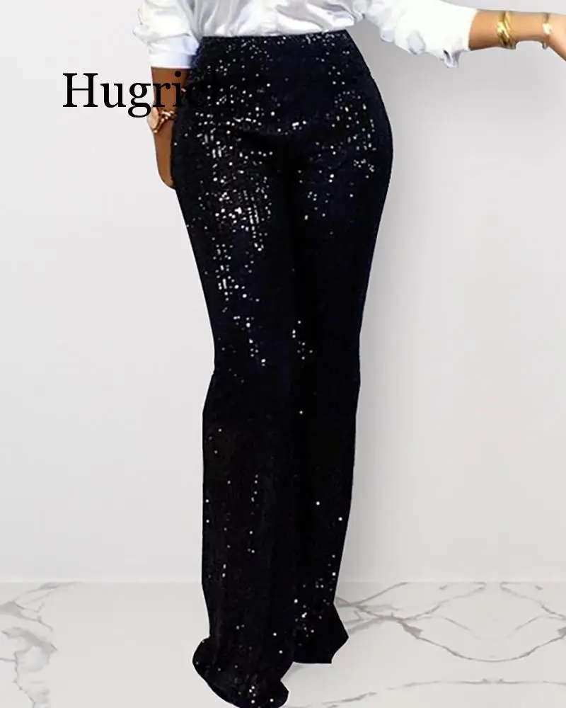 Promo 2020 Sequins High Waist Wide Pants Woman Glitter Silver Black High Waist Trousers for Female Party Dance Flared Legs Pants