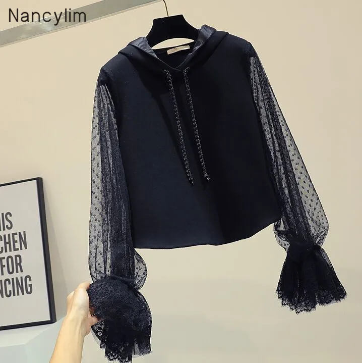 New Hooded Sweatshirt Women Spring Autumn Point Embroidery Hollow-out Horn Sleeve Crop Top Hoodie Students Black Hoodies Femme