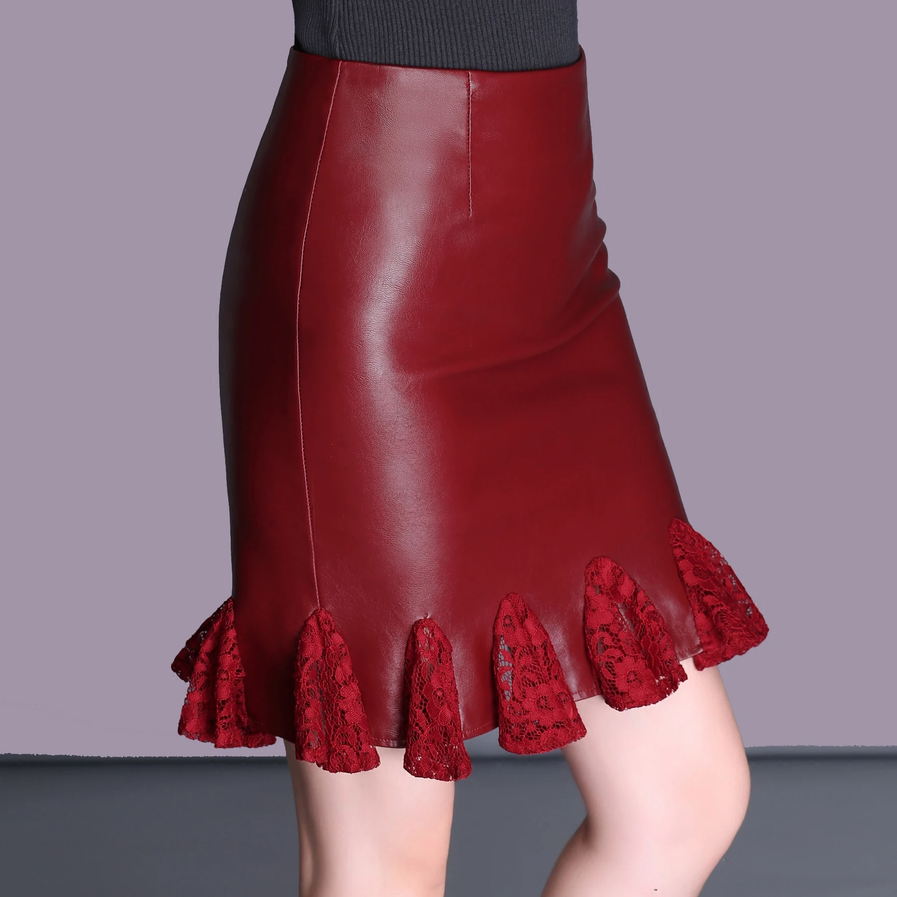 Sale Plus Size Solid Empire Lace Splice Pu Spring Trumpet Woman Mermaid Skirts Female Oversized Leather Skirt Lady Above Knee Skirt