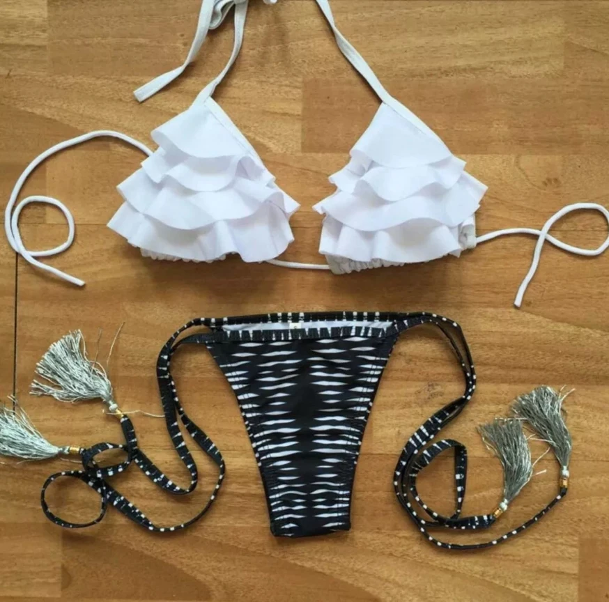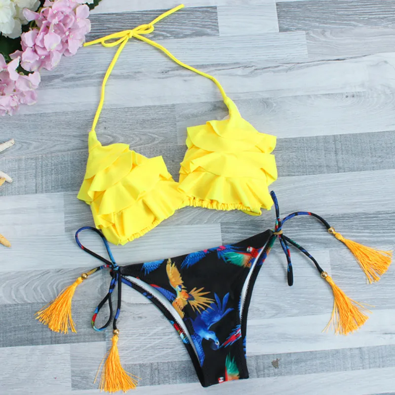 Sale Ruffled Frill Halter Flower Bikinis Sets Bathing Suits Low Waist Tie Swimsuits 2018 Brazil Tassel Swimwear Retro Printed