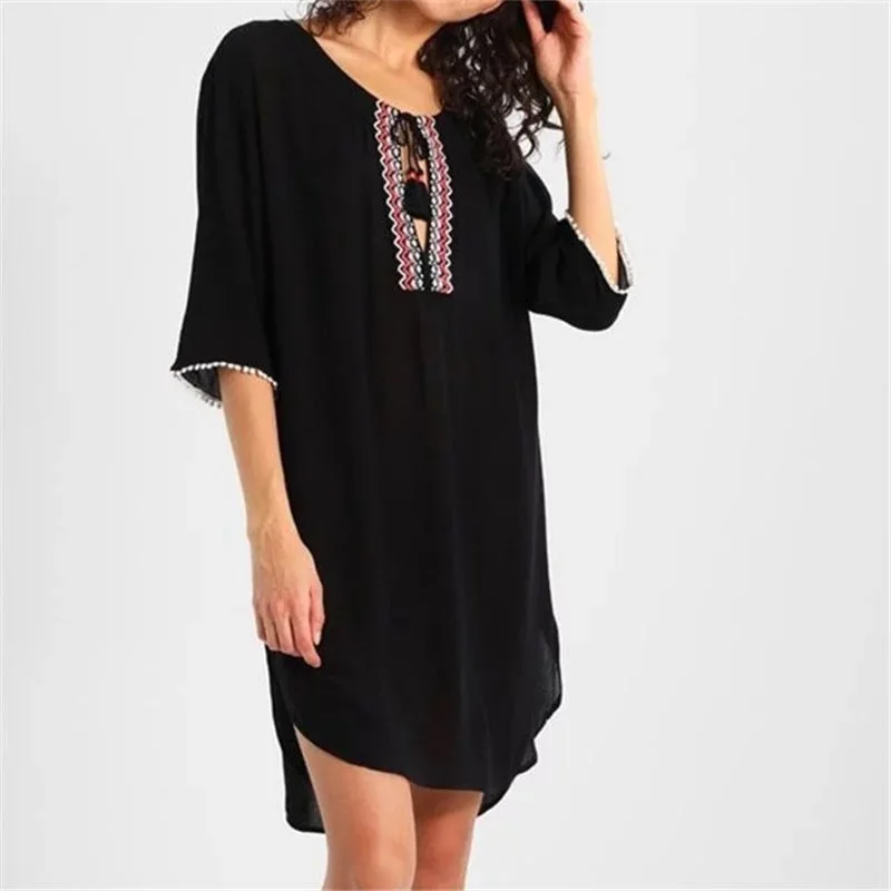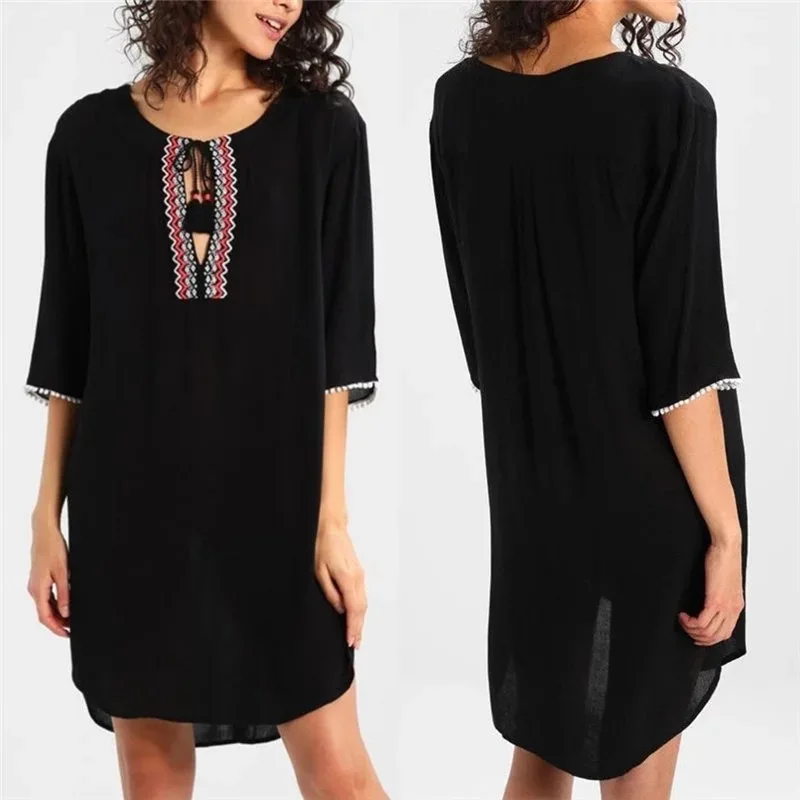 Sale Women's Woven Embroidered O Neck Cotton Swimsuit Bathing Suit Beach Cover Up Tunic Dress