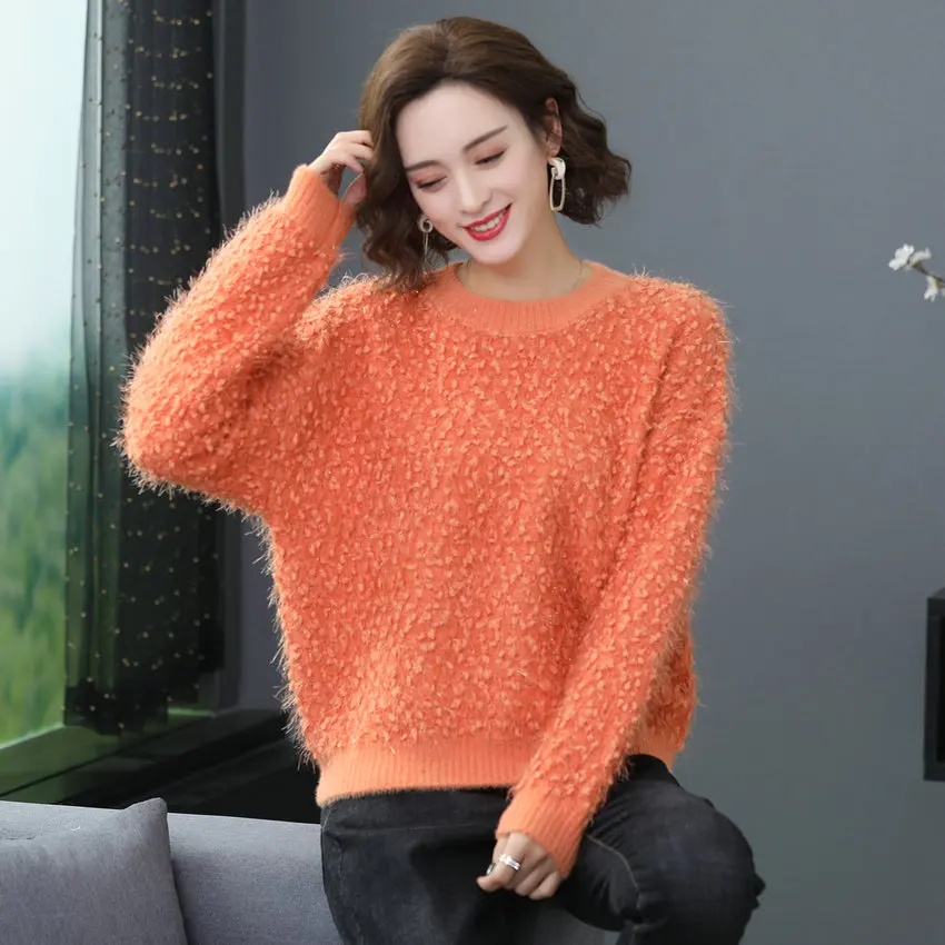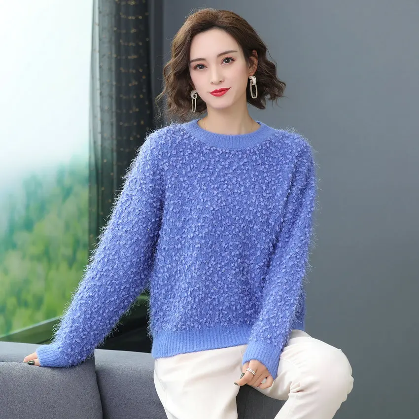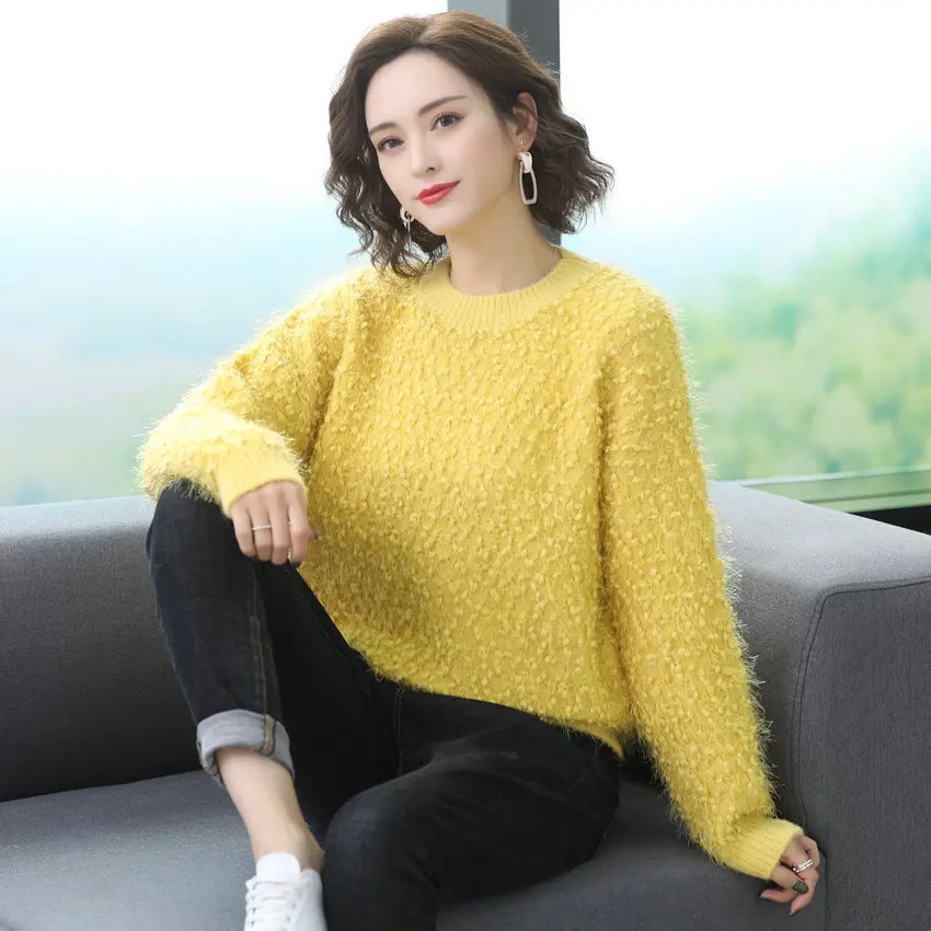Best Offer Winter Autumn Woman Warm Soft Pullover Sweater Boucle Yarn Knitted Tops Round Collar White Yellow Blue Green Pink Knitwear Women